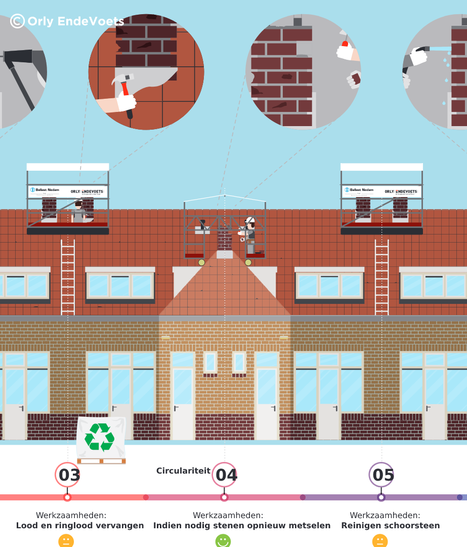 In opdracht van Woonbedrijf hebben we in 2020 en 2021 >350 schoorstenen gerenoveerd in Drents Dorp, Gemeente Eindhoven. Hiervoor zijn 20 speciale daksteigers gemaakt die steeds in zijn geheel werden verplaatst naar de volgende woning zodat er hoog, droog én veilig gewerkt kon worden.